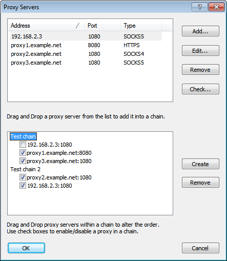 Connections between proxy servers will be established in the order they are displayed in the list (from top to bottom). You can change the order using the drag-and-drop operation on proxies within the chain. Uncheck a proxy to disable it.