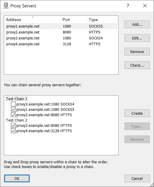 The connections between proxy servers will be established in the order displayed in the list (from top to bottom). You can change the order by dragging and dropping proxies within the chain. Uncheck a proxy to disable it.