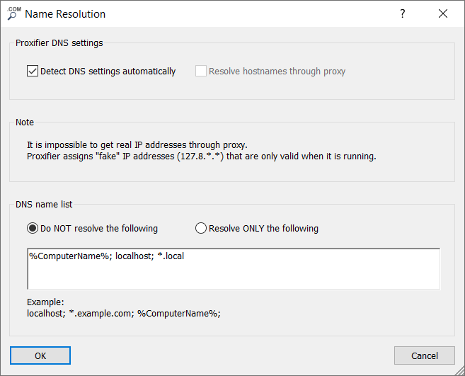 Proxifier can resolve hostnames through a proxy server, which is a valuable feature when local name resolution does not work properly or causes problems. Generally, it is not recommended to use this feature in all other cases as it has some limitations in comparison to the normal method of resolution. For example, it is impossible to get a real IP address through a proxy, so Proxifier must assign a placeholder (fake) IP address, such as 127.8.*.*, that is valid only within the local computer. Also, Proxification Rules based on IP addresses will not work in this case.