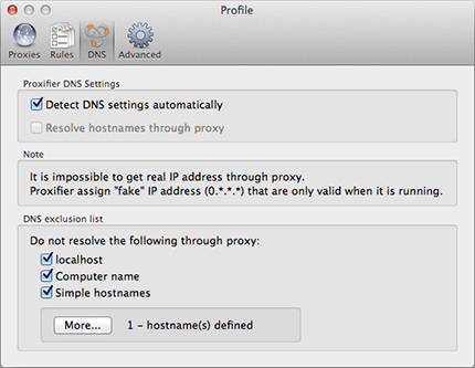 By default the Detect DNS settings automatically mode is enabled. In this case, Proxifier continuously tracks the network condition and if system DNS is unavailable Proxifier automatically enables the Resolve hostnames through proxy option.