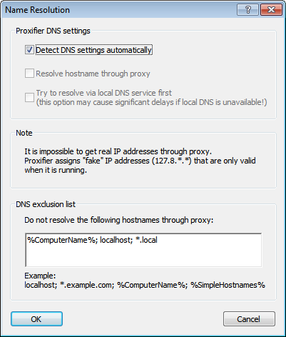 Proxifier can resolve hostnames through a proxy server. This feature is useful when a DNS server is not available or restricted. Generally speaking, it is not recommended to use this feature in all other cases as it has some limitations versus the normal way of resolving. For example, it is impossible to get a real IP address through a proxy so Proxifier has to assign placeholder (fake) IP addresses like 127.8.*.* which are only valid within the local computer. Proxification rules based on IP addresses will also not work in this case.