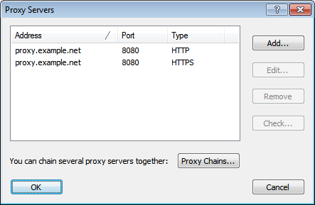 Suppose proxy.example.net:8080 is a usual HTTP proxy and supports HTTP on port 80 and HTTPS on port 443 and we want to configure Proxifier to process HTTP/HTTPS connections (web browsing) through it.