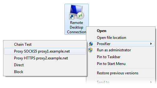 Apart from Proxification Rules you can set proxification options manually for certain applications. When Proxifier is installed and running, Windows adds a “Proxifier” command to the exe-file context menu.
