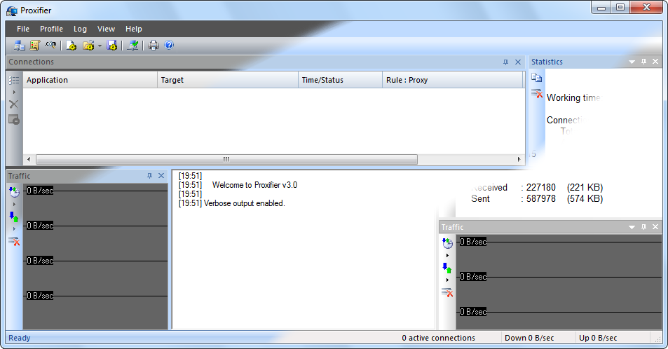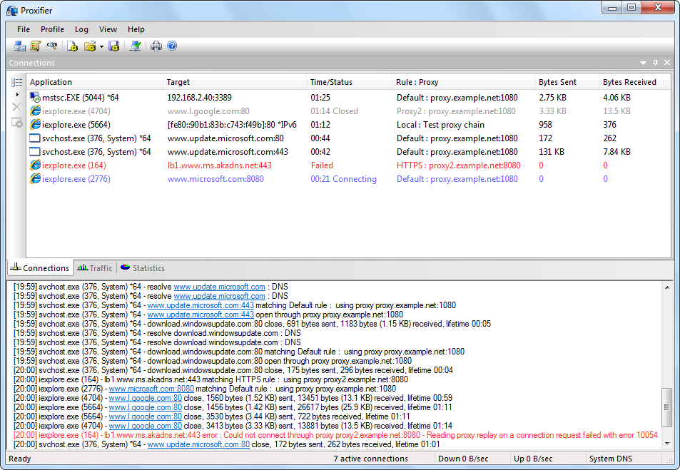 Proxifier log messages are now more detailed, including all new parameters listed in the above paragraph. Additionally a number of new messages were introduced. Now Proxifier can be configured to output DNS requests, rules processing messages and more. Verbosity of the output can be changed via the Log menu. It is possible to set different log levels for screen and file output and the log file directory is also configurable.