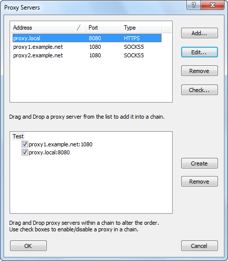 The core Proxifier configuration has been significantly redesigned and improved. Now you can specify independent multiple proxy servers in (Profile->Proxy Settings...). It is also possible to create multiple proxy chains and manipulate them via the new UI.