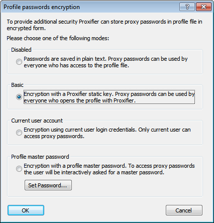 Profiles can contain passwords for proxy servers. To protect this information Proxifier supports encryption. You can change encryption options at Profile->Advanced->Password Encryption...
