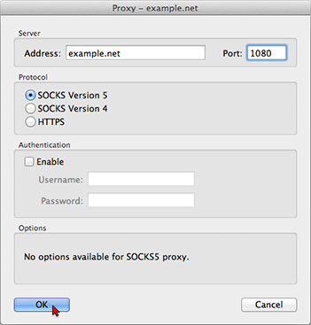 Fill in the form specifying the details of the proxy server (address, port, protocol, etc.) that you want to add and click OK:
