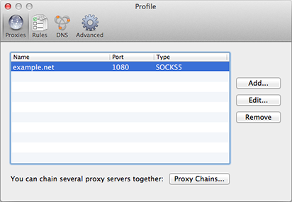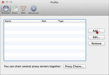 To make the connections work through a proxy server or a chain of proxy servers, you must first define a proxy server in Proxifier. Click Proxy Servers... in the Profile menu or click on the icon located on the toolbar: