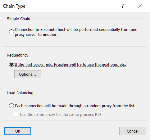 To enable this feature, you must create a proxy chain and set the chain type to or .