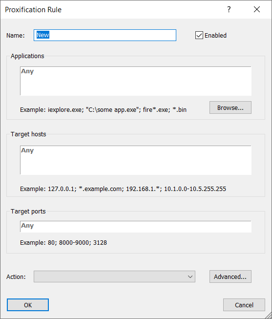 For example, if you specify Applications only and leave Targets and Ports blank, Proxifier will process all connections of the specified applications regardless of the target hosts and ports.