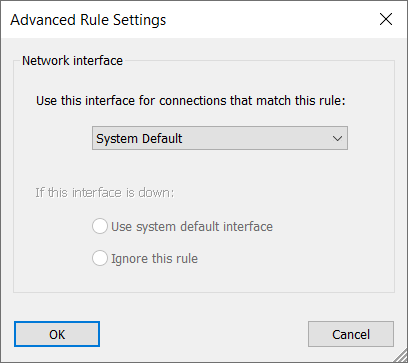 If you select a specific interface, you must specify what Proxifier should do if the interface is down (disconnected). It can either Use system default interface or Ignore the rule.