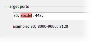 Proxifier filters the text fields, and incorrect symbols are indicated in red. For example, there can be no letters in the Target ports field.