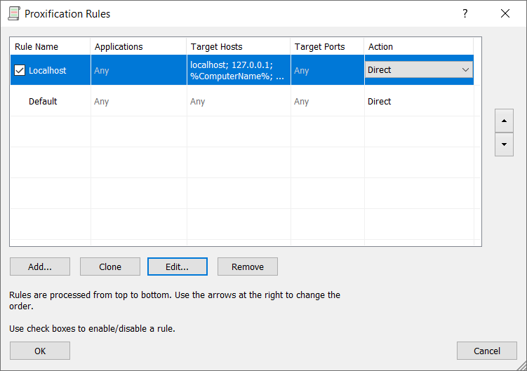 By default, each profile also has a predefined rule called Localhost. When this rule is enabled, Proxifier does not tunnel local (loopback) connections on the computer. Some applications, such as Firefox, may depend on loopback connections. You can edit or remove this rule, but it is best to keep it enabled unless you are absolutely sure that you need to tunnel connections to 127.0.0.1 through a proxy.