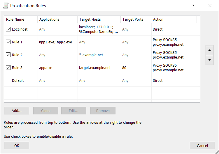 For example, if you assign a proxy server as an action for the Default rule and define no other rules, Proxifier will process all connections through this proxy.