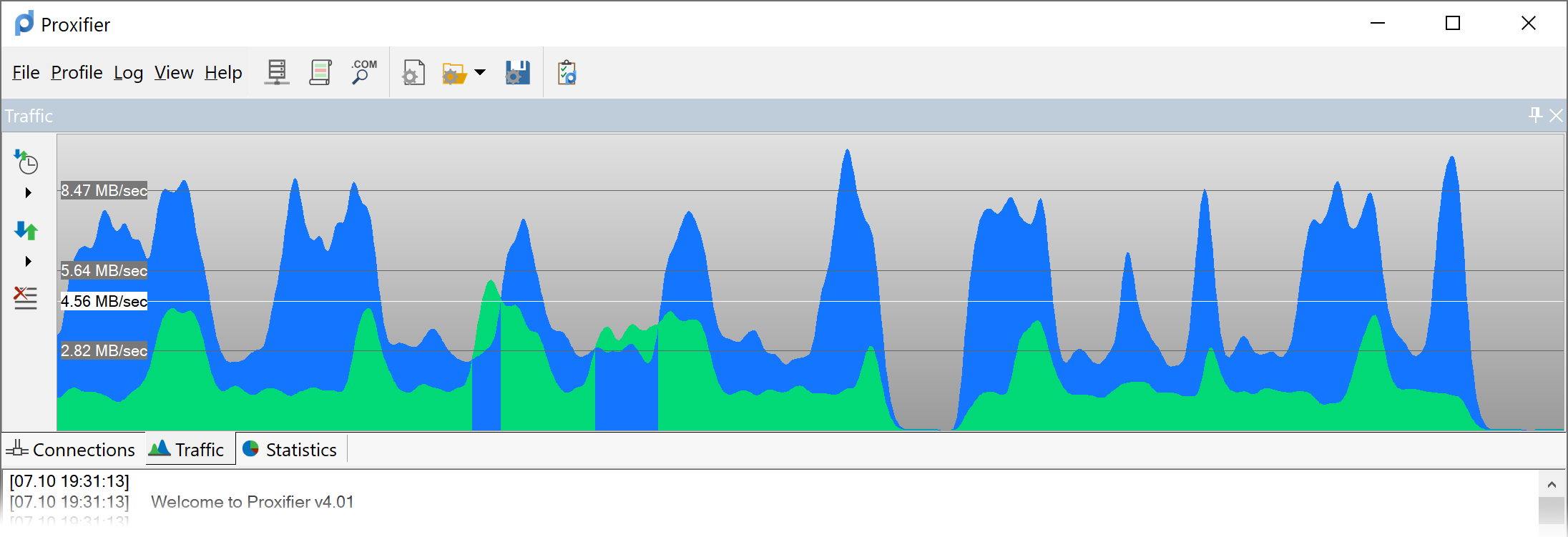 The Traffic pane displays a graphic representation of the amount of information being transferred.