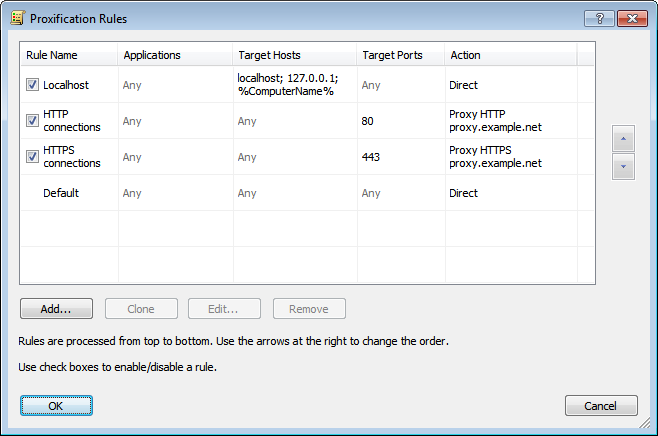 Suppose proxy.example.net:8080 is a usual HTTP proxy and supports HTTP on port 80 and HTTPS on port 443 and we want to configure Proxifier to process HTTP/HTTPS connections (web browsing) through it.
