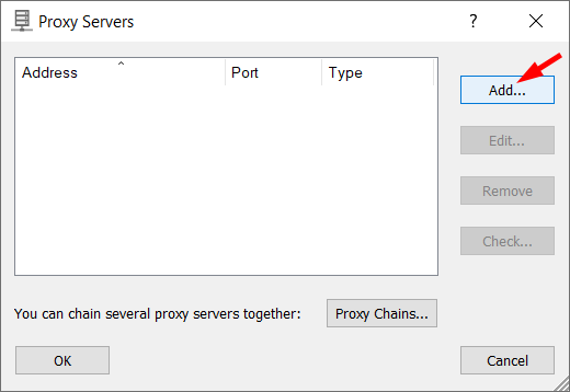 To make the connections work through a proxy server or chain of proxy servers, you must first define a proxy server in Proxifier. Choose in the menu or click the icon on the toolbar.
