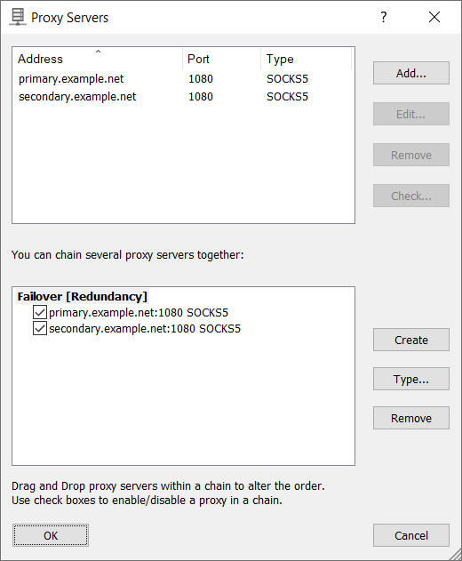 You can use the checkboxes to enable/disable particular proxies in the chain. This option has nothing to do with the failure status. If a proxy is unchecked, Proxifier simply ignores it. Additionally, a checked proxy can be marked as [failed] and ignored.